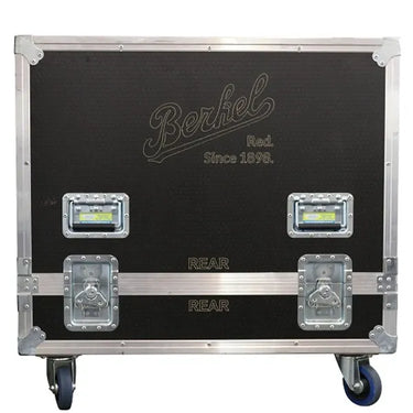 Praktische zwarte transportkoffer met roestvrijstalen details, speciaal ontworpen voor het veilig en eenvoudig vervoeren van de Berkel B114 snijmachine. De koffer is uitgerust met wielen, stevige sloten en het herkenbare Berkel-logo op de zijkanten. Dankzij een speciale uitsparing past de machine perfect en stevig in de kist.