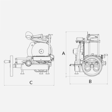 • Specially cast aluminum alloy and ABS Inox and rubber feet for total stability during cutting • The flywheel protrudes only about 33mm below the work table (the minimum on the market) to allow opening of the lower drawers • Adjustable leg kit to raise the cutting machine an additional 22mm if necessary • 265mm chrome-plated steel blade with professional profile: reduces waste and ensures perfect slices • Fast forward and reverse feed system for food plates combined with a manual millimeter knob for perfect product positioning • Classic Berkel design of the tower, combining elegance and robust design • Gold-colored decorations to accentuate painted parts • Classic Berkel square profile flywheel, internally balanced to prevent unintended rotation in any position • Removable sharpener included with a dual-motion control system to increase sharpening precision • Meter plate opening knob with 8 positions to adjust cutting thickness from 0.15mm to 1.3mm • Very thin residual product to minimize material waste • Steel deflector with simplified magnetic coupling for better removal of slicesCLEANING AND HYGIENE