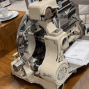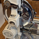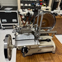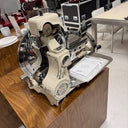 PERFORMANCE • Specially cast aluminum alloy and stainless steel and rubber feet for total stability while cutting • Adjustable legs in different configurations 319mm 100cr6 chromed steel blade with professional profile: reduces waste and ensures perfect slices • Fast forward and reverse feed system for food trays combined with a manual millimetric knob for perfect product positioning • Classic Berkel design of the tower, a combination of elegance and robust design • Gold-colored decorations to enhance painted parts • Classic Berkel square profile flywheel internally balanced to prevent unintended rotation in any position • Removable sharpener included with a single-motion control system to increase sharpening reliability • Measuring plate opening knob with 11 positions to adjust the adhesive thickness from 0 mm to 1.5 mm • Very thin residual product to minimize material waste • Wide steel deflector with easy coupling for better slice removal NFC TAG cast into the machine housing as a certificate of authenticity CLEANING & HYGINE • Stainless steel professional food plate with a removable system for easy machine cleaning • Supported stainless steel product press holder for complete product locking • Wide space for quick and easy cleaning and a rear space to collect waste material • Quick removal system of the slice deflector for easy cleaning of the machine • Stainless steel removable drip tray, dishwasher safe SAFETY- Stainless Steel Full Blade Ring Guard